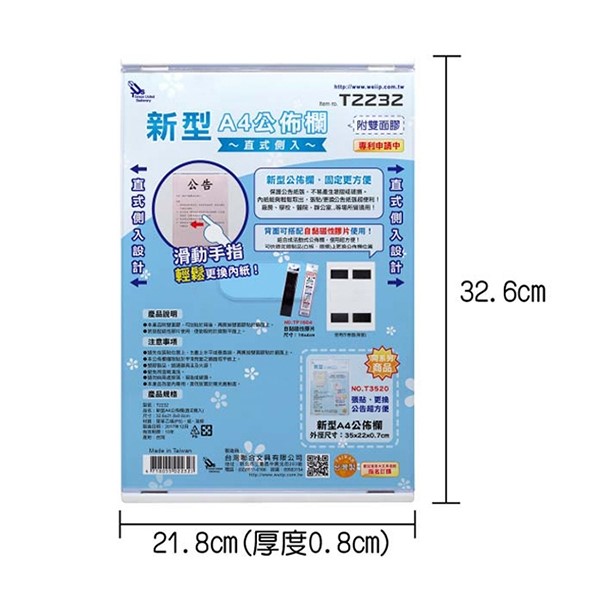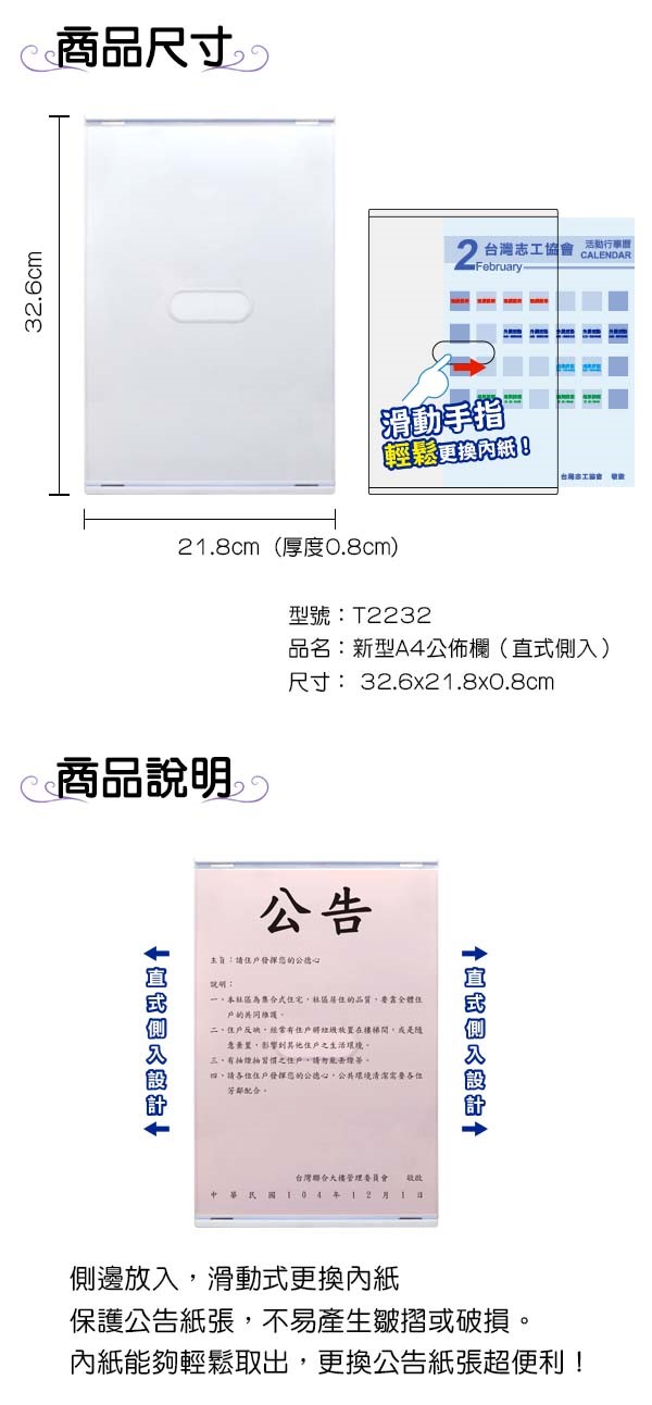 ▶側邊放入,滑動式更換內紙 ▶保護公告紙張,不易產生皺摺或破損。 ▶內紙能夠輕鬆取出,張貼/更換公告紙張超便利!